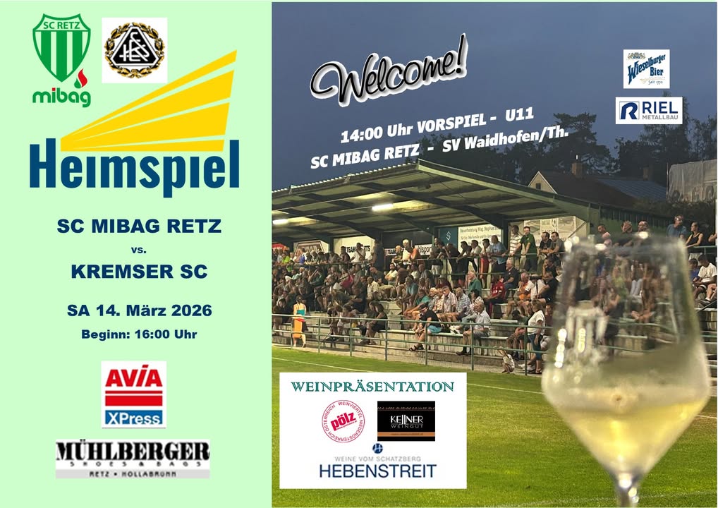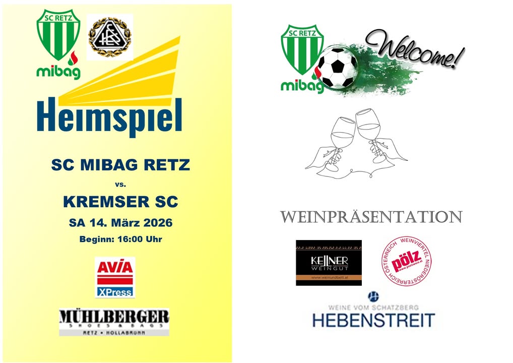 ⚽️Im nächsten Heimspiel am kommenden Samstag, den 14. März 2026 empfängt der SC MIBAG RETZ um 16:00 Uhr den Kremser SC im Retzer Stadion.